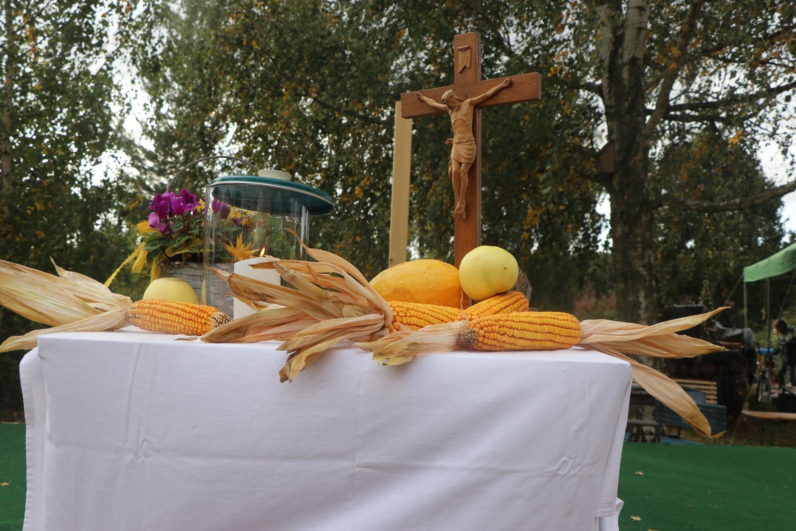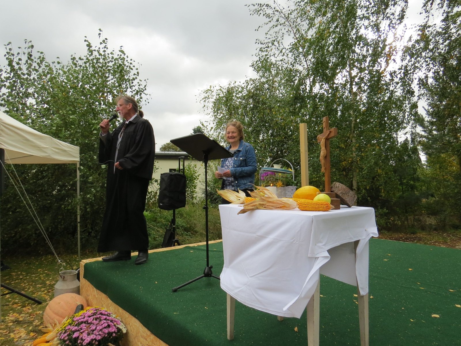 Pfarrer Thomas Meyer tauschte für den Gottesdienst zum Erntedankfest die Kanzel mit der Bühne auf dem Hof der Familie Wehde. Mit dem Gottesdienst wurde das Hoffest eröffnet. Als Ersatz für die Himmelsleiter diente eine Stehleiter. Der Pfarrer ging der Frage nach, wo der Himmel beginnt. Wer will in den Himmel? Warum bereiten die Menschen noch immer anderen die Hölle auf Erden? Eine Hölle auf Erden sind die Kriege und bewaffnete Auseinandersetzungen. Gegen diese geht die Bürgerinitiative an.